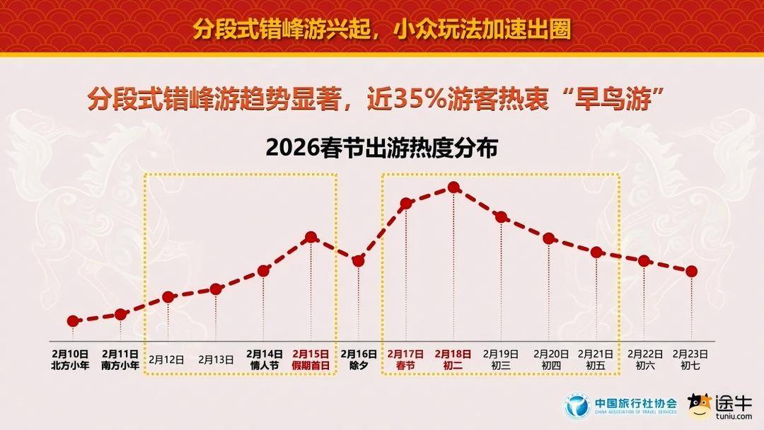 数据炫耀,本年春节假期,旅游用户分段式出游趋势显着,选拔假期前错峰的早鸟游用户占比接近35%。第一波出游岑岭始于南边小年(2月11日)后,第一波出游峰值在情东说念主节及假期首日(2月15日),属于出游和返乡的访佛态。最新预订数据炫耀,展望大岁首二(2月18日)将迎来本年春节假期的出游最岑岭值。