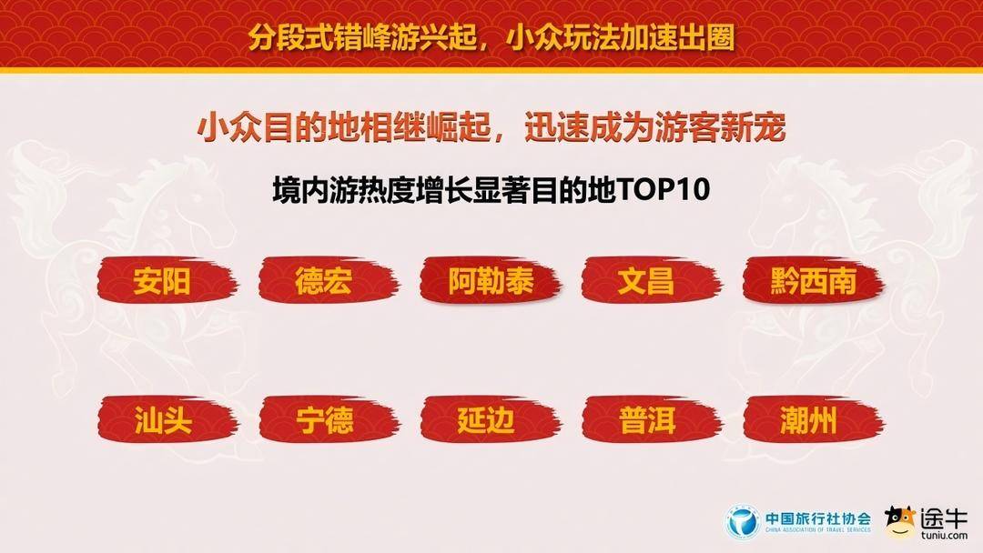 新兴、小众主义地点面,途牛达成现在最新预订数据炫耀,安阳、德宏、阿勒泰、文昌、黔西南、汕头、宁德、延边、普洱、潮州等低线及县域城市预订热度增长显耀。