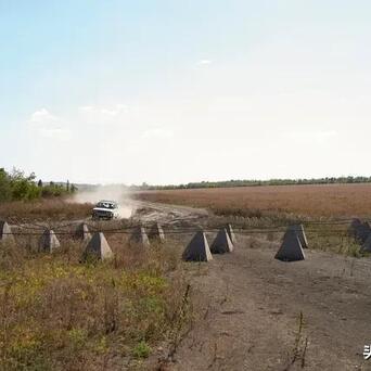 图四,恰索夫•亚尔,乌克兰的防护工事,由带有铁丝网的混凝土反坦克桩(“龙牙”)构成。