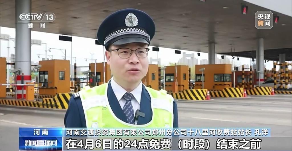 河南交通投资集团有限公司郑州分公司十八里河收费站站长 孔洋:在4月6日的24点免费时段落拓之前,一定要合理安排我方的下收费站技能。最佳能提前10到20分钟,在就近的收费站下高速,享受这个24点之前的免费路段,然后再从头上高速。