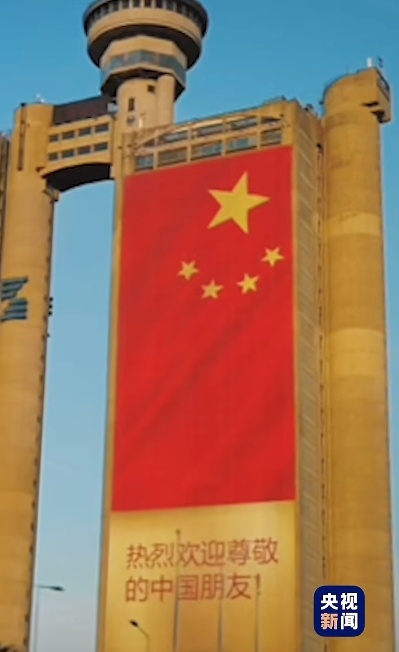 位于贝尔格莱德的一栋20多层高楼半侧楼体遮蔽上了巨型中国国旗,并写有“利弊接待尊敬的中国一又友!” 口号。