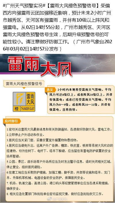 3月2日15时许,广州市中心下起大暴雨。据悉,受偏西标的强雷雨云团加强移近影响,瞻望改日2小时广州市越秀区、河汉区有强雷雨,并伴有10级以上阵风和强雷电。从02日14时55分起,广州市越秀区、河汉区雷雨大风橙色预警信号成效,后期升级预警信号的可能性较小。请提神作念好闪耀职责。